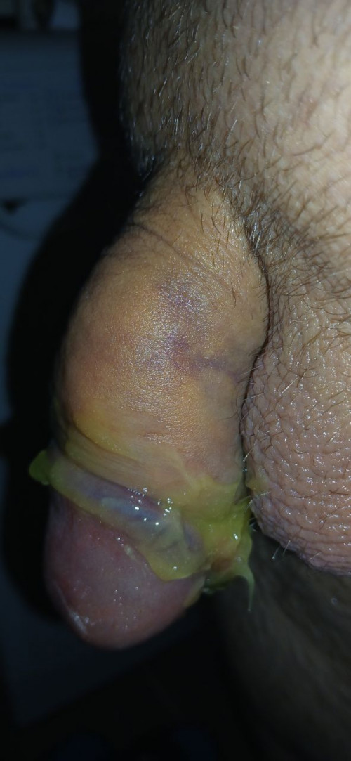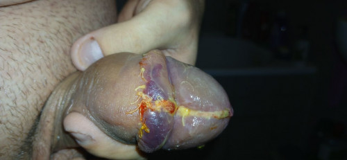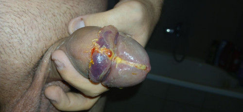 Penis jak widać. Na trzonie się trochę zafioletowił. Opuchlizna chyba troszeczke większa. Nie wiem czy za mocno ścisnąłem czy to powstaje jakas "komplikacja" pozabiegowa ;c